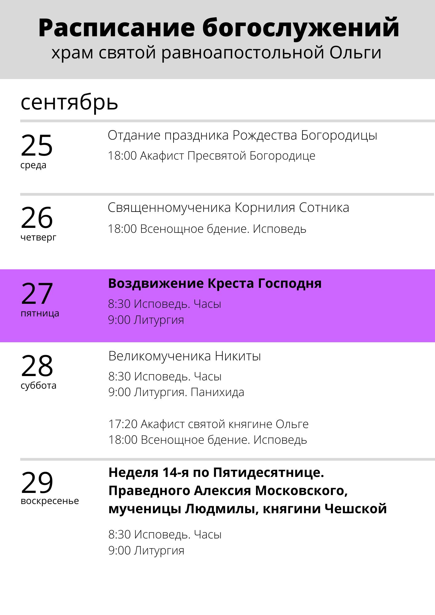 Понедельник, 24. Равноапостольной великой княгини Ольги. Престольный праздник.